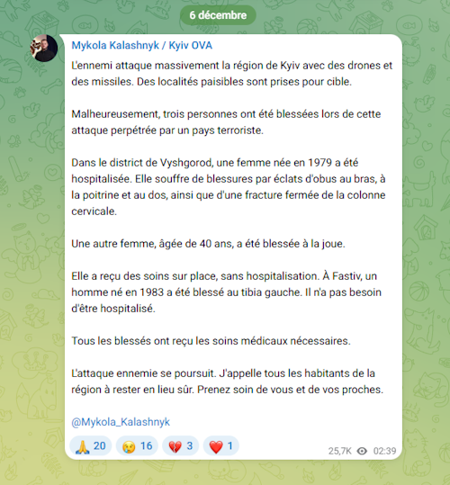Capture d’fermeture – en même temps que interprétation algorithmique de l’ukrainien contre le gaulois – de la brochure de Mykola Kalachnyk sur Telegram